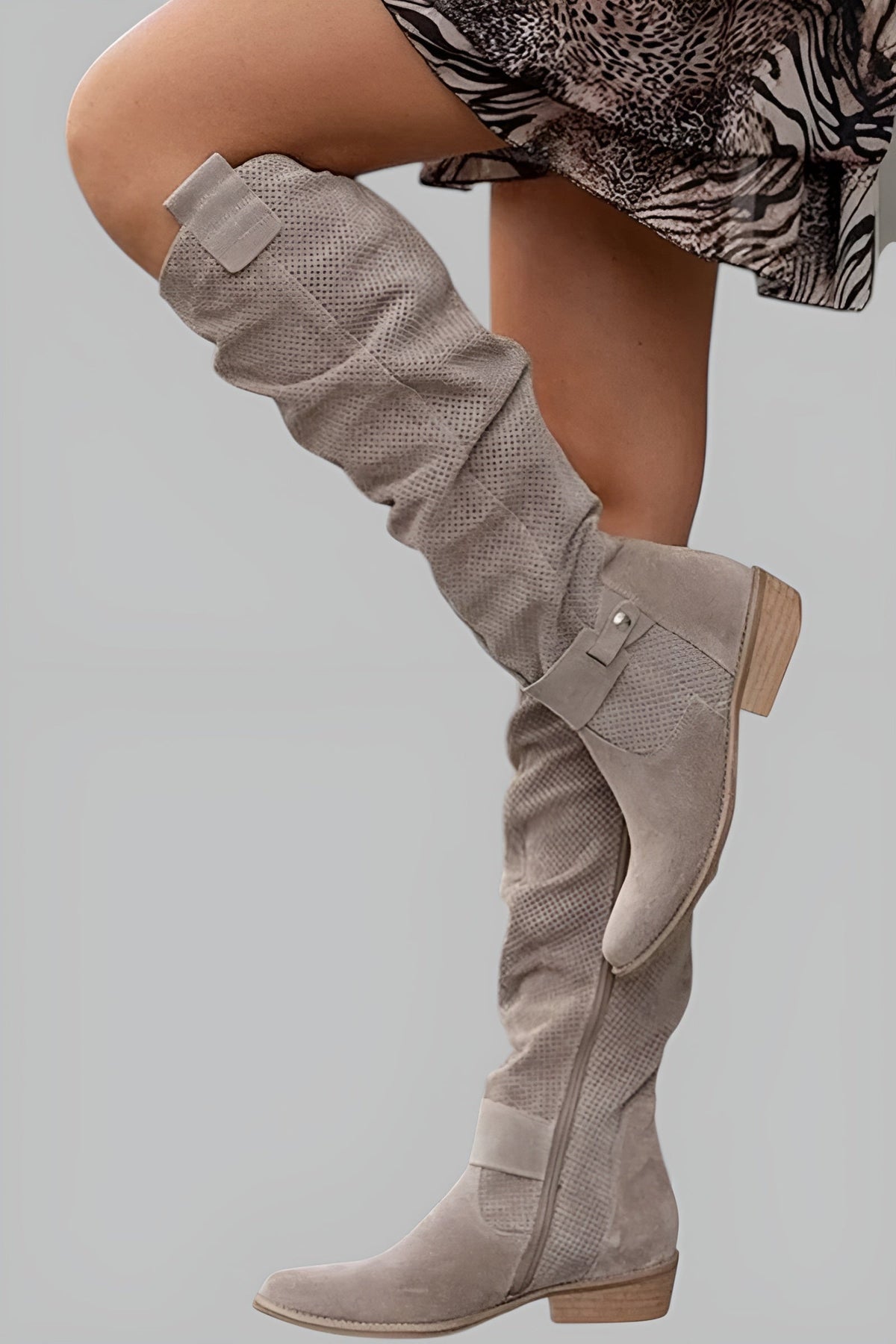 Freja™ er de knæhøje støvler, der kombinerer et blødt ruskindslook med en moderne, afslappet pasform. Med deres lave hæl og alsidige beige farve er de perfekte til både casual outfits og mere elegante looks.